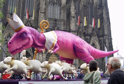 Religionsfreie Zone: "Heidenspaß statt Höllenqual!" Unser 10 Meter langes und 4 Meter hohes "Anti-WJT-Maskottchen" ("Dino-Mobil") bereicherte das Stadtbild Kölns Zurück
